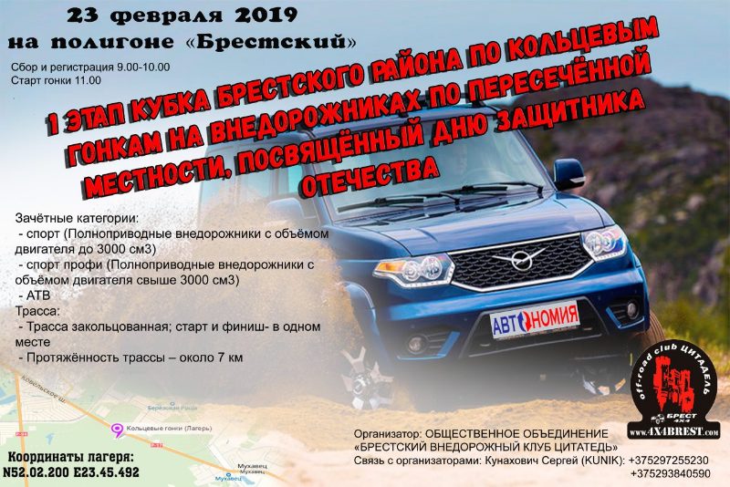 23 февраля, в субботу, на полигоне «Брестский» состоится 1 этап Кубка Брестского района по кольцевым гонкам на внедорожниках по пересечённой местности, посвящённый Дню защитника Отечества.